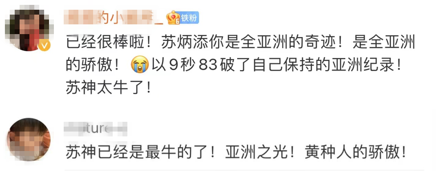 在微博上,不少网友激动不已,大加称赞:一个我们中国乃至亚洲都不擅长的项目,百米第一个黄种人苏炳添,创造了历史,打破了亚洲记录,苏炳添我们中国的骄傲,亚洲第一人。