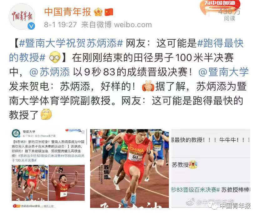 据了解,苏炳添是暨大2017届国际经济与贸易专业硕士,同样是暨南大学体育学院副教授。而苏炳添的公开课,也是暨大选修课里最难抢的课程。
