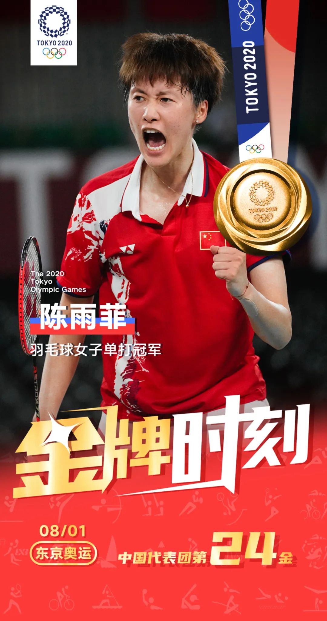 北京时间8月1日,东京奥运会羽毛球女单决赛,中国选手陈雨菲以大比分2-1击败中国台北选手戴资颖夺得金牌,帮助中国代表团摘得本届奥运会的第24枚金牌。