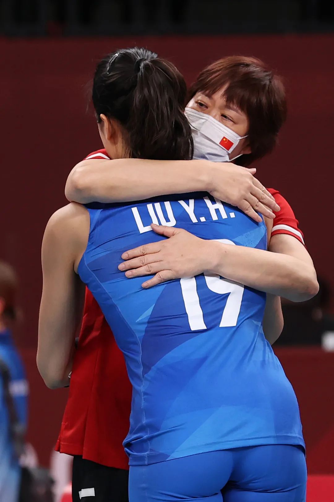 赛后,郎平和每一名队员拥抱,女排姑娘则集体鞠躬致谢郎指导。