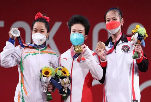 中国选手侯志慧、印度选手米拉巴伊和印尼选手艾萨在颁奖仪式上。新华社记者 杨磊摄