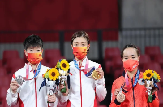 7月29日,颁奖仪式上,陈梦、孙颖莎主动邀请季军伊藤美诚一起站上最高领奖台合影。