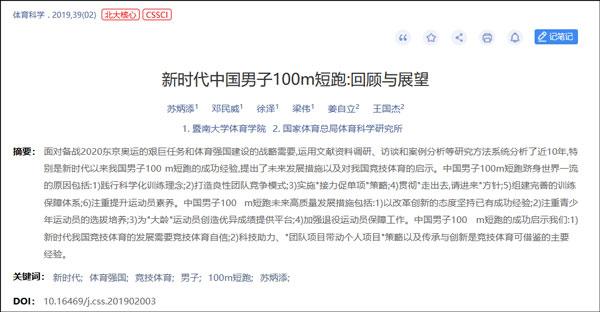 而他的论文《新时代中国男子 100m 短跑:回顾与展望》也在社交网站走红,该文第一作者苏炳添亲自为论文 " 跑数据 " 的学术精神令人敬佩。
