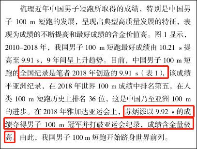 但论文毕竟是研究新时代中国男子百米短跑,当然要提创造中国男子短跑历史的苏炳添。于是,这篇文章开始高频出现 " 笔者 " 自己创造的成绩。
