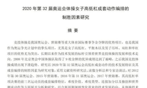 硕士论文设计创编2020年第32届奥运会高低杠成套模式,为我国女子体操队在第32届东京奥运会高低杠项目夺取金牌提供借鉴和参考。