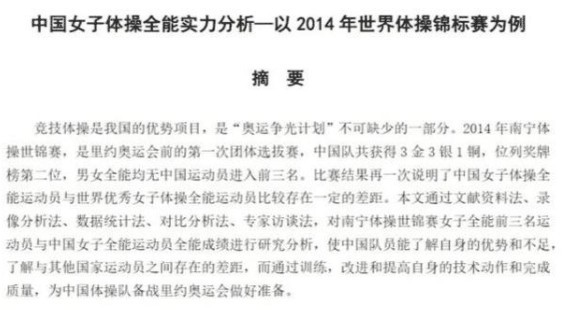 本科论文对南宁体操世锦赛女子全能前三名运动员与中国女子全能运动员全能成绩进行研究分析,使中国队员能了解自身的优势和不足,了解与其他国家运动员之间存在的差距,而通过训练,改进和提高自身的技术动作和完成质量,为中国体操队备战里约奥运会做好准备。