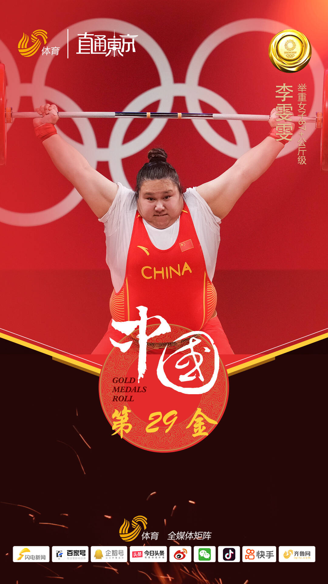 齐鲁网·闪电新闻8月3日讯 8月2日,在东京奥运会举重女子87公斤以上级的比赛中,中国选手李雯雯获得金牌。她凭借总成绩320公斤、领先第二名37公斤的绝对实力夺冠!这是中国代表团在本届奥运会的第29金,本届奥运会中国举重队夺得7金,祝贺李雯雯!
