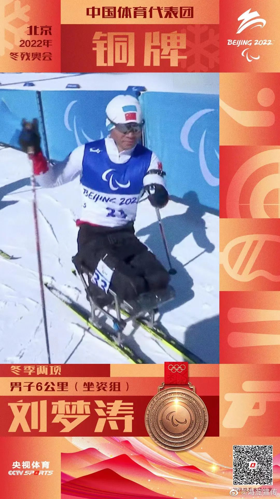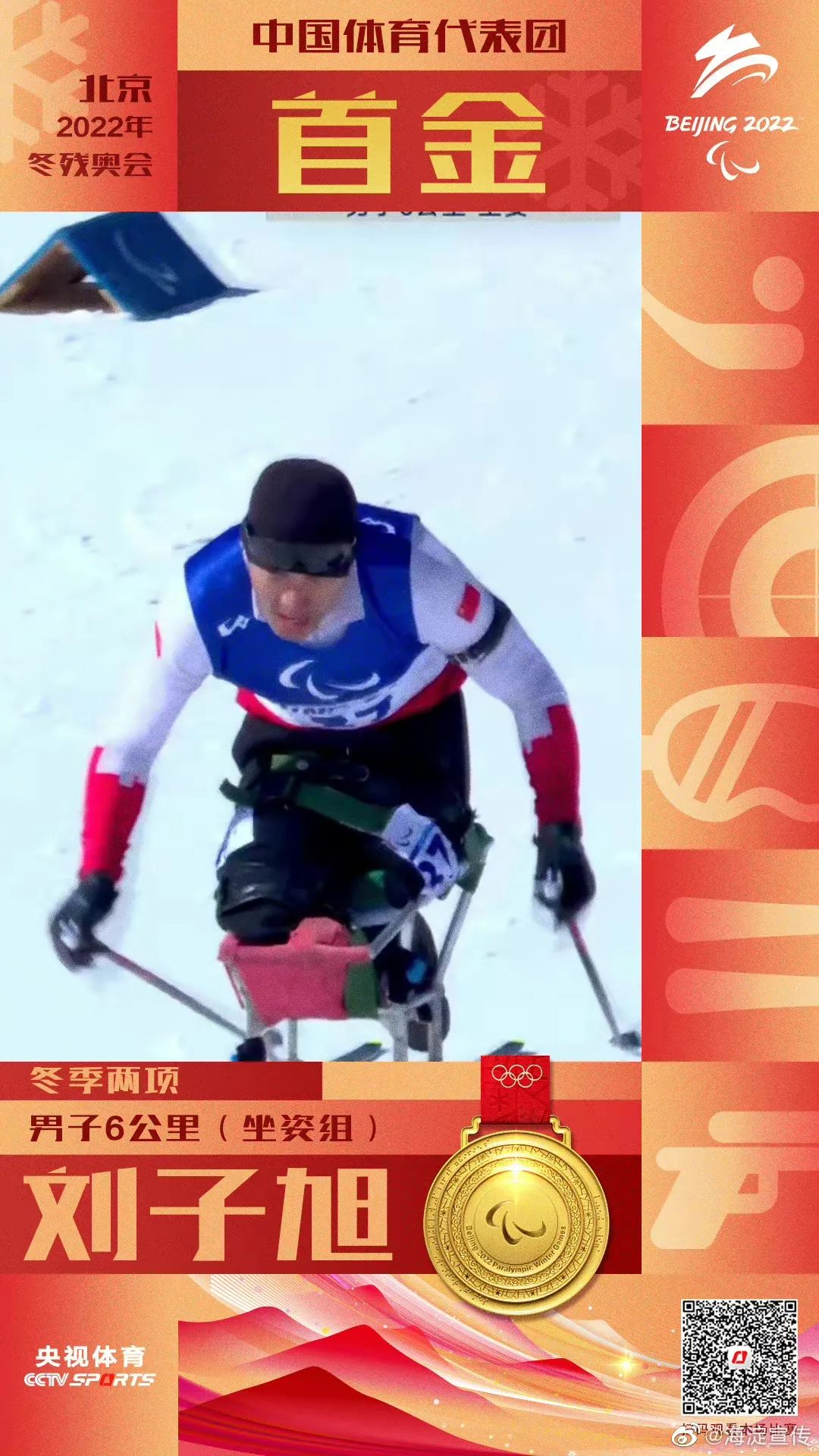 在北京冬残奥会冬季两项男子6公里(坐姿组)比赛中,刘子旭夺得金牌,这是中国代表团在本届冬残奥会上获得的首枚金牌!
