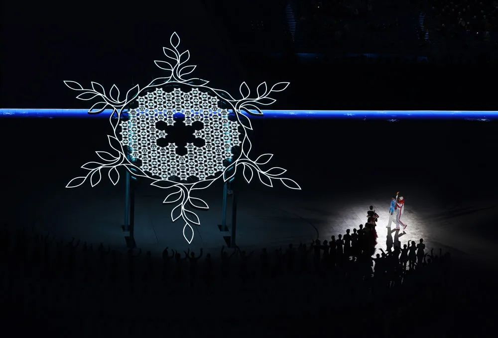 3月4日晚,最后一棒火炬手李端将火炬嵌入“大雪花”中央。新华社记者 宋彦桦 摄