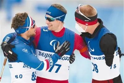 3月11日,北京冬残奥会残奥冬季两项男子长距离站姿组比赛后,法国代表团运动员达维耶(左)、挪威代表团运动员于尔塞特(中)和加拿大代表团运动员阿伦兹相拥庆祝。人民日报记者 厉衍飞摄