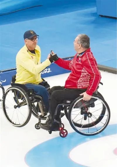 3月11日,在北京冬残奥会轮椅冰壶半决赛中,瑞典队战胜斯洛伐克队,晋级决赛。图为双方运动员赛后互相致意。人民日报记者 记者 薛 原摄