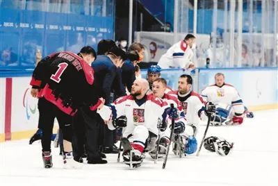 3月9日,在北京冬残奥会残奥冰球决赛资格赛后,中国队运动员和工作人员与捷克队运动员互相致意。人民日报记者 王 亮摄