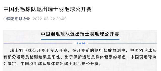 中国羽毛球协会22日发布公告称,瑞士羽毛球公开赛于当天开赛,在开赛前的例行核酸检测中,中国羽毛球队有部分运动员检测结果呈阳性。出于保护运动员身体健康的考虑,中国羽毛球协会决定,中国羽毛球队集体退出瑞士羽毛球公开赛。