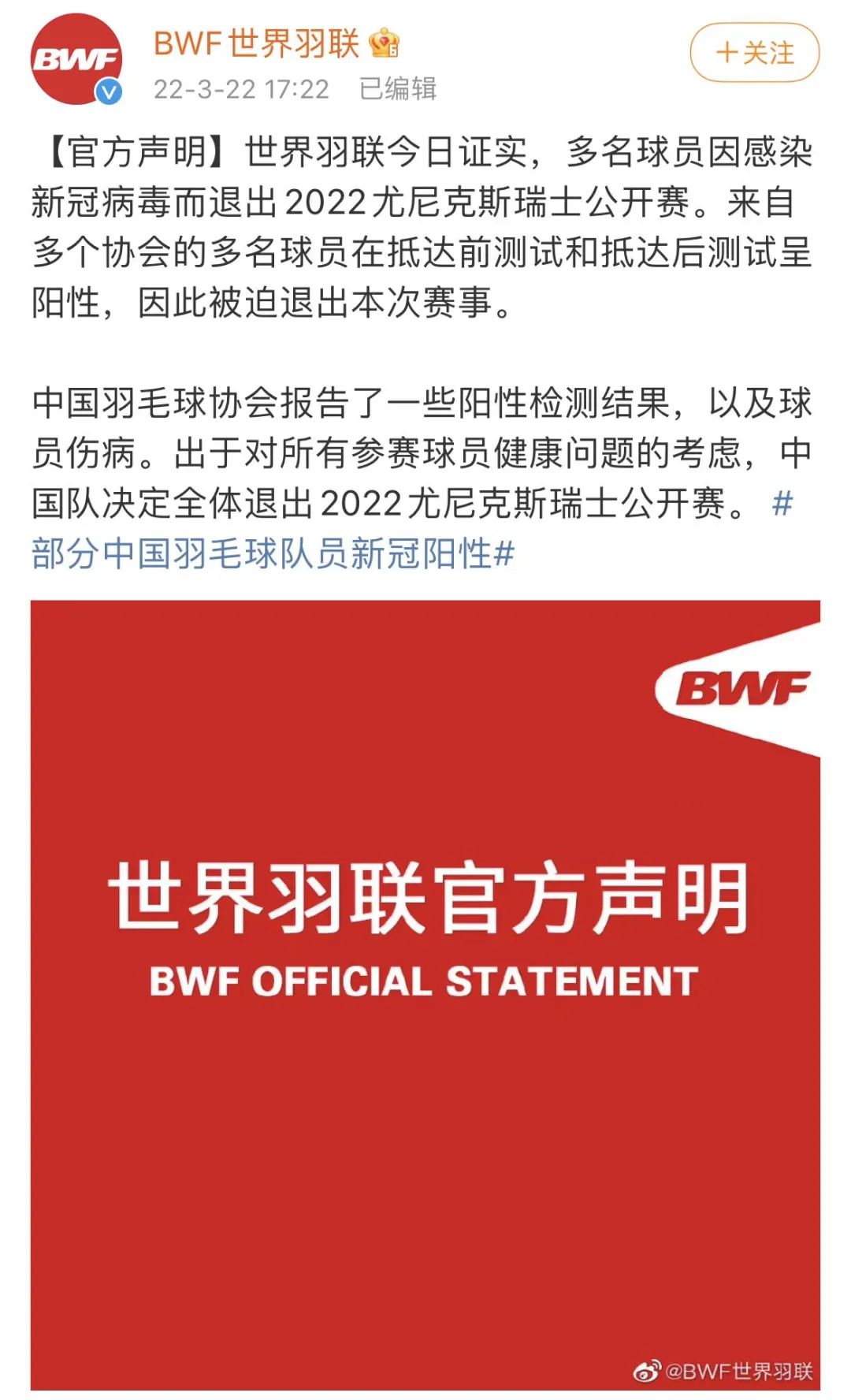 3月22日 BWF世界羽毛球联合会官方微博发布官方声明称,中国羽毛球协会报告了部分运动员新冠阳性检测结果以及球员伤病,中国队决定全体退出2022尤尼克斯瑞士公开赛。