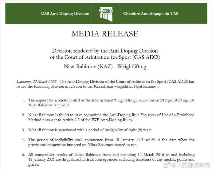 当地时间22日,国际体育仲裁法庭(CAS)通过官网发布公告称,由于哈萨克斯坦举重运动员拉希莫夫违反相关反兴奋剂规定,他在2016年3月15日至2021年1月18日期间的所有比赛成绩均不合格,并收回所有奖牌、分数和奖品。
