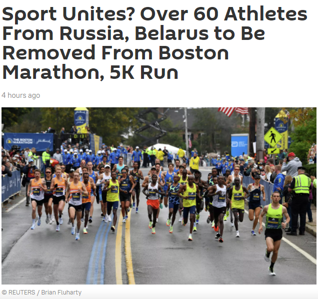 据俄罗斯卫星通讯社7日报道,美国波士顿马拉松赛组委会发言人周四表示,来自俄罗斯和白俄罗斯的60多名运动员,已经被取消了参加波士顿即将举行的著名马拉松和5公里赛跑的资格。
