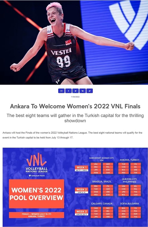 2022年4月11日,国际排联宣布2022年世界女排联赛总决赛将在土耳其安卡拉举办,8支队伍将于7月13日至17日角逐今年总冠军。根据国际排联规定,总决赛应是淘汰赛,四场1/4决赛将在7月13日、7月14日进行,7月16日进行半决赛,金牌赛和铜牌赛将在7月17日举行。