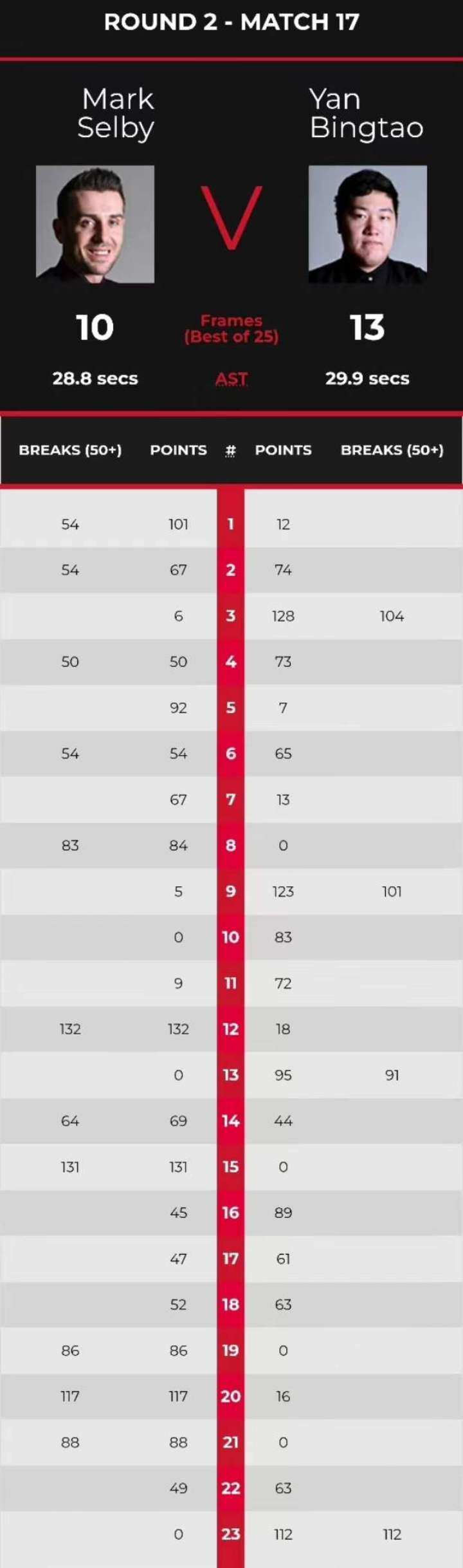 值得一提的是,本场比赛还创造了克鲁斯堡剧院的新纪录。双方的第22局共用时1小时27分24秒,其中净比赛时间为1小时25分22秒,这是世锦赛在克鲁斯堡剧院举办的45年以来,用时最长的单局比赛。颜丙涛赢下此局并拿到赛点,并最终以一杆单杆112分拿下比赛。此前这一纪录是2019年世锦赛布雷切尔与加里·威尔逊之间超过79分钟的一局。