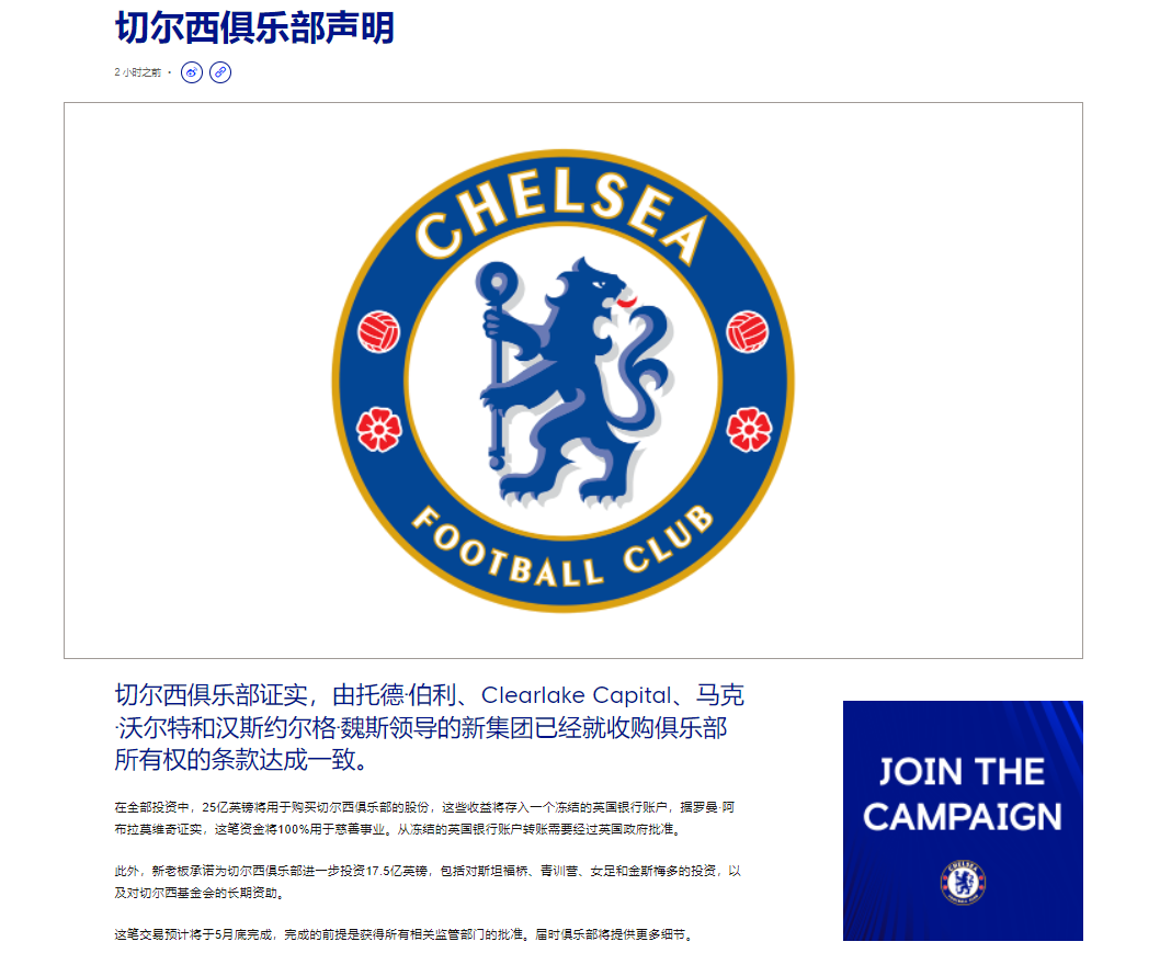 综合自切尔西俱乐部官网、观察者网、PP体育、北京青年报、每经网、环球网、澎湃新闻