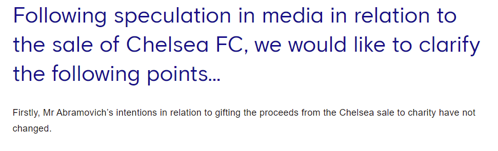 需要明确的是,阿布先生无法接触或控制这些资金,并且在出售后将无法接触或控制这些资金。自从他最初宣布以来情况发生了变化,但他仍然致力于为切尔西足球俱乐部寻找一个好的托管人,并确保收益用于慈善事业。
