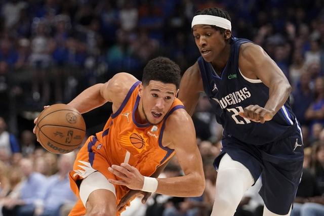 5月8日,太阳队球员布克(左)在比赛中带球突破。新华社/美联