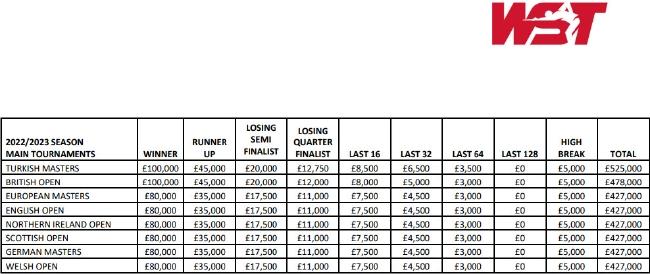 土耳其大师赛和英国公开赛的冠军奖金将提升到10万英镑。赢得英格兰、北爱尔兰、苏格兰和威尔士公开赛的那些球员,将赚到8万英镑,与德国大师赛和欧洲大师赛的冠军奖金相同。