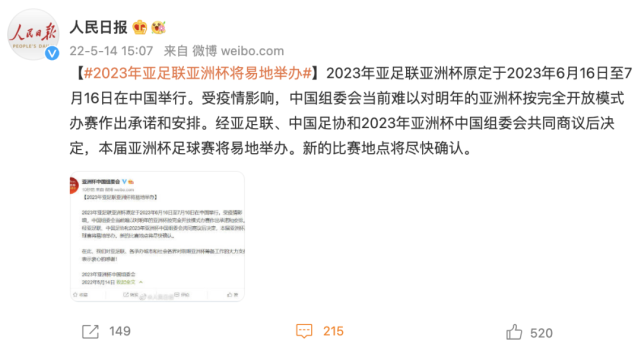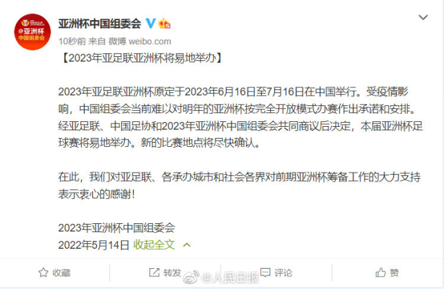 2023年亚足联亚洲杯原定于2023年6月16日至7月16日在中国举行。受疫情影响,中国组委会当前难以对明年的亚洲杯按完全开放模式办赛作出承诺和安排。经亚足联、中国足协和2023年亚洲杯中国组委会共同商议后决定,本届亚洲杯足球赛将易地举办。新的比赛地点将尽快确认。