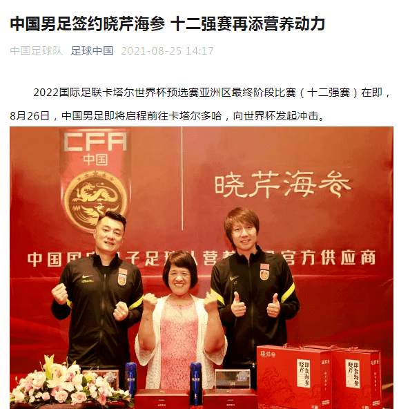 尽管国足海参的梗被球迷群嘲,但是该企业赞助国足是事实。2021年8月26日,中国男足即将启程前往卡塔尔多哈前,中国足球协会副秘书长,中国福特宝足球产业发展公司总经理赫晓峰将“中国国家男子足球队营养食品官方供应商”的牌匾授予大连晓芹食品有限公司董事长王晓芹,双方合作正式展开。