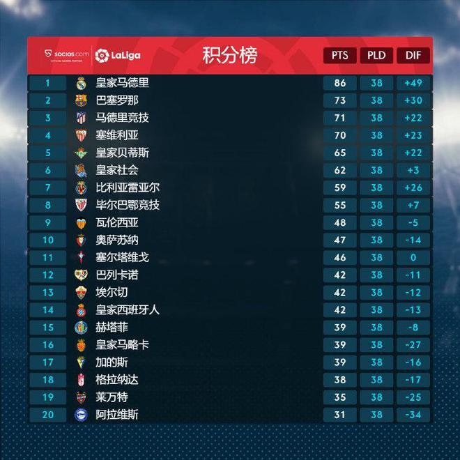 皇马本赛季提前夺冠,巴萨则提前一轮成为亚军。马竞、塞维利亚分别排在三四位,这四支球队拿到了下赛季欧冠门票。贝蒂斯和皇家社会提前一轮锁定欧联杯门票,比利亚雷亚尔则在末轮战胜巴萨之后拿到了欧会杯门票。