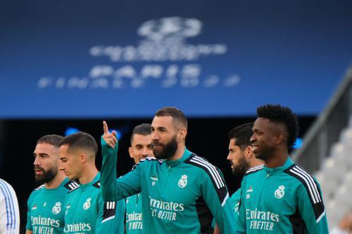 皇马球员本泽马(右三)、维尼修斯(右一)在训练中。新华社照片