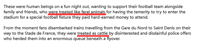 这篇以现场英国球迷的“第一视角”撰写的文章,甚至将法国警察描述成了是“法国政府雇佣的霸凌者”,并指控他们把只是希望来看场好球的英国人“当牲口一般对待”,面对乱局只知道无差别地喷洒胡椒面进行镇压。