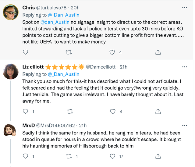 另外,这些英国球迷还表示因为这些赛场外让他们“气抖冷”的遭遇,导致他们难以关注比赛本身。最终利物浦输掉了比赛,而这对于他们来说已经不重要了。
