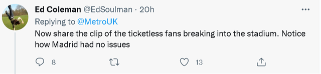 目前,这篇文章已经在境外的社交网站上引起了不少英国球迷的共鸣,他们纷纷称赞《地铁报》的编辑记者说出了他们的心声,有人还要求英国政府为英国球迷做主。