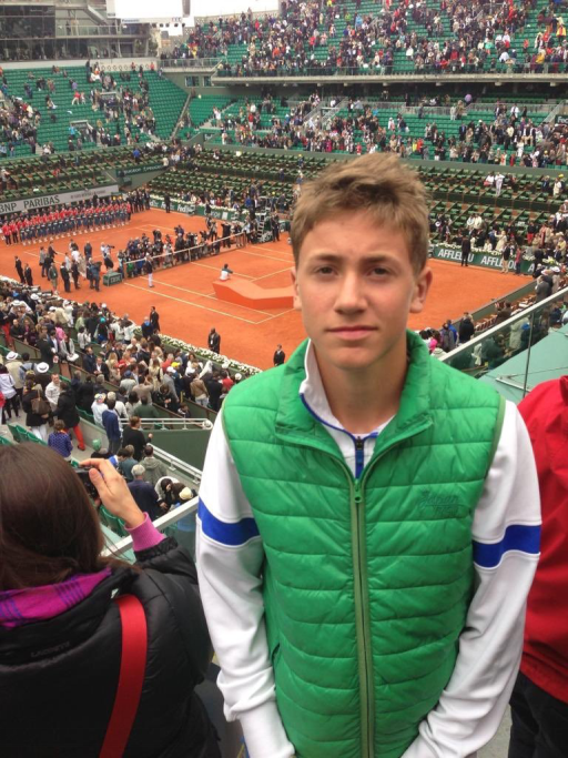2013年鲁德以纳达尔捧杯为背景,在观众席与偶像合影。