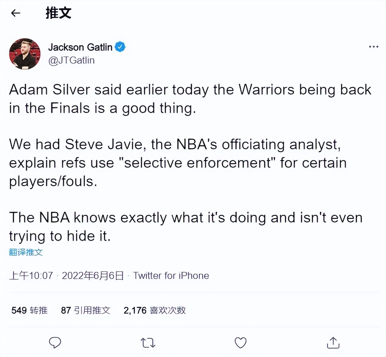 他在推特上写道,NBA总裁亚当肖华在早些时候说“勇士重返总决赛是件好事”,而NBA裁判分析员贾维也表示裁判会对某些球员、犯规进行“选择性执法”,NBA知道自己在做什么(偏袒勇士),甚至都不想掩饰了。