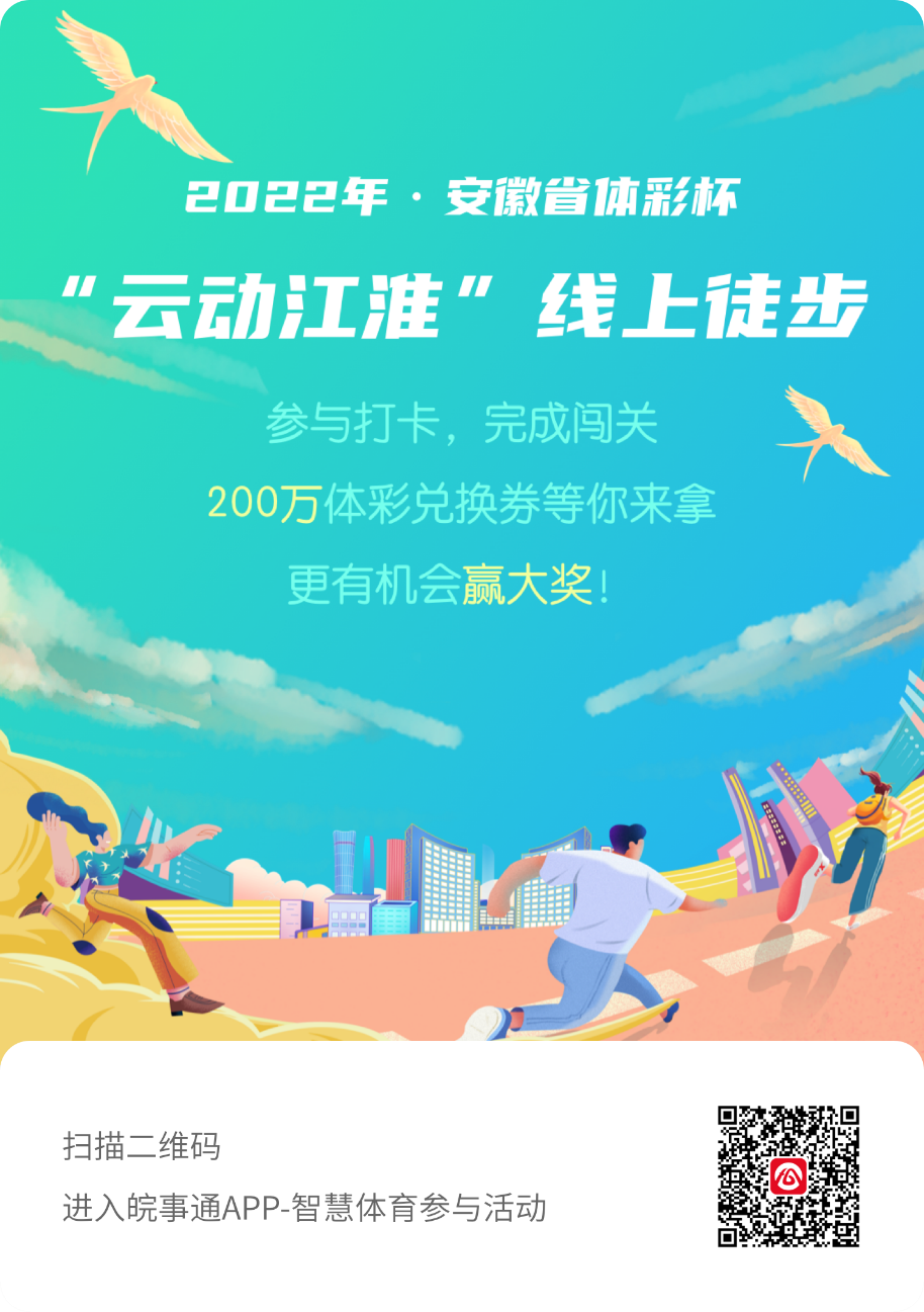 6月10日至8月8日期间,登录皖事通APP搜索“智慧体育 ”进入活动主页,或扫码直接进入活动主页,即可参与活动。