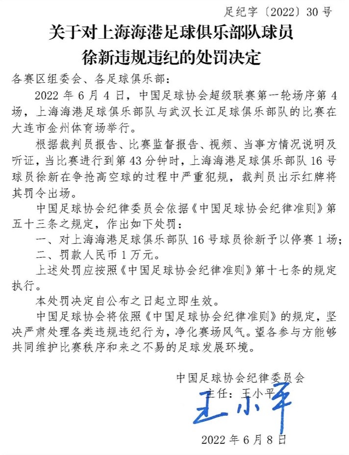 足协判罚:徐新在争抢高空球过程中严重犯规,被停赛1场+罚款1万;徐新返回休息室途中踢碎通道玻璃门,停赛停赛1场+罚款1万。