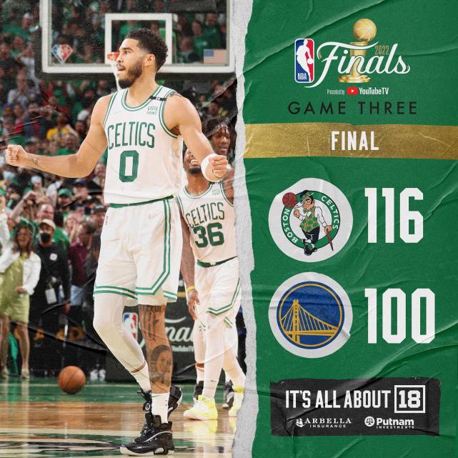 北京时间6月9日,2021-22赛季NBA总决赛继续进行。在刚刚结束的总决赛G3中,凯尔特人队主场以116:100击败勇士队,将系列赛总比分变成2:1,重新占据主动。