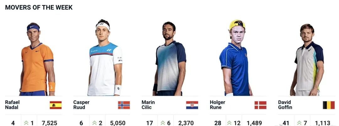 连杀两位俄罗斯人卢布列夫和梅德维德夫、凑齐大满贯全四强荣誉的西里奇,排名也上升6个名次,来到17名。