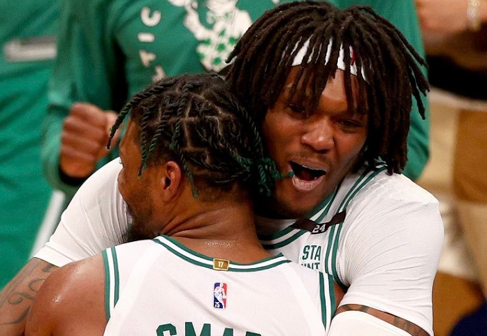 斯玛特兑现承诺,无愧绿军队魂。G3之前,斯玛特曾喊话格林:如果你想提升身体对抗强度,我们奉陪到底!斯玛特不仅说到做到,而且还超额完成了任务,攻防两端极具侵略性。斯玛特打了39分钟,17投8中,三分球7中3,罚球7中5,砍下24分+7篮板+5助攻。尤其是在勇士队第三节掀起反扑的节骨眼上,斯玛特用三记三分球帮助绿军重新稳住局势,那叫一个强硬。同时,斯玛特与双探花一起书写了一项尘封38年的NBA纪录。据统计,绿军三巨头成为NBA自1984年以来第一个在总决赛单场均至少砍下20分+5篮板+5助攻的三人组,比肩1984年的湖人三巨头贾巴尔魔术师和库珀。