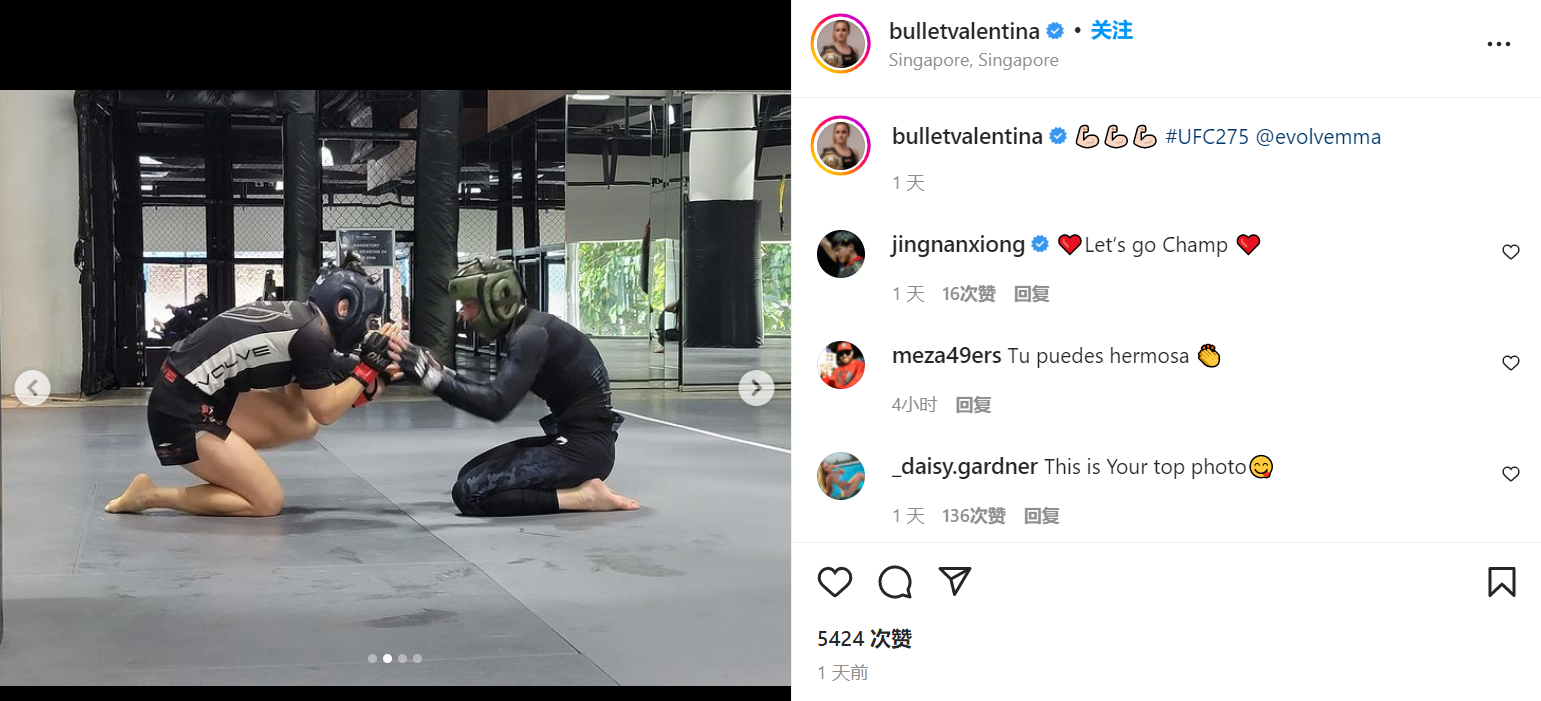 近日,UFC女子蝇量级现役冠军,女子P4P排名第一位的瓦伦缇娜·舍甫琴科(Valentina Shevchenko)在社交媒体上发布了多张与ONE冠军赛草量级现役世界冠军熊竞楠一起实战训练的照片,引起了大量网友的围观与好评。