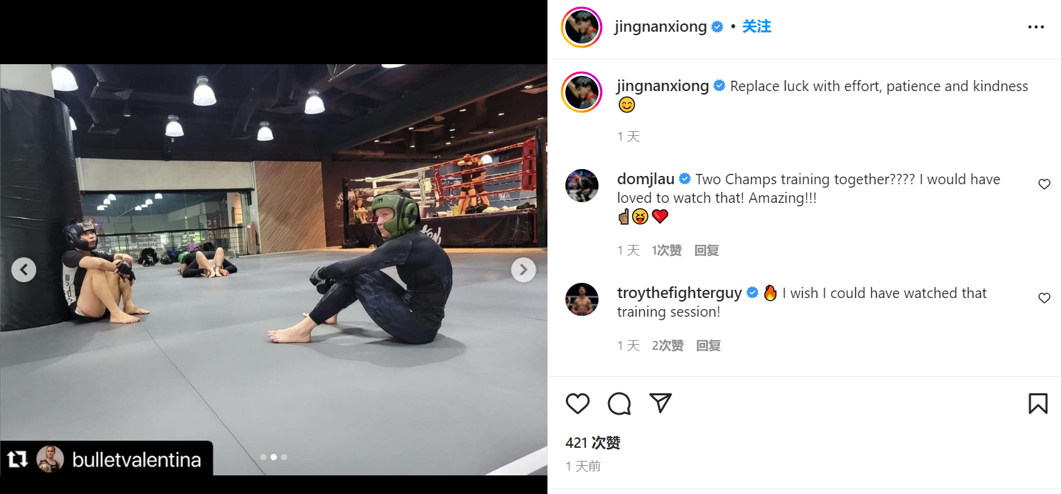 曾与熊竞楠激战过五个回合的老对手劳拉·巴林(Laura Balin)也留言道:“太棒了,两位冠军一起分享训练,我要向你们俩表达敬意!”