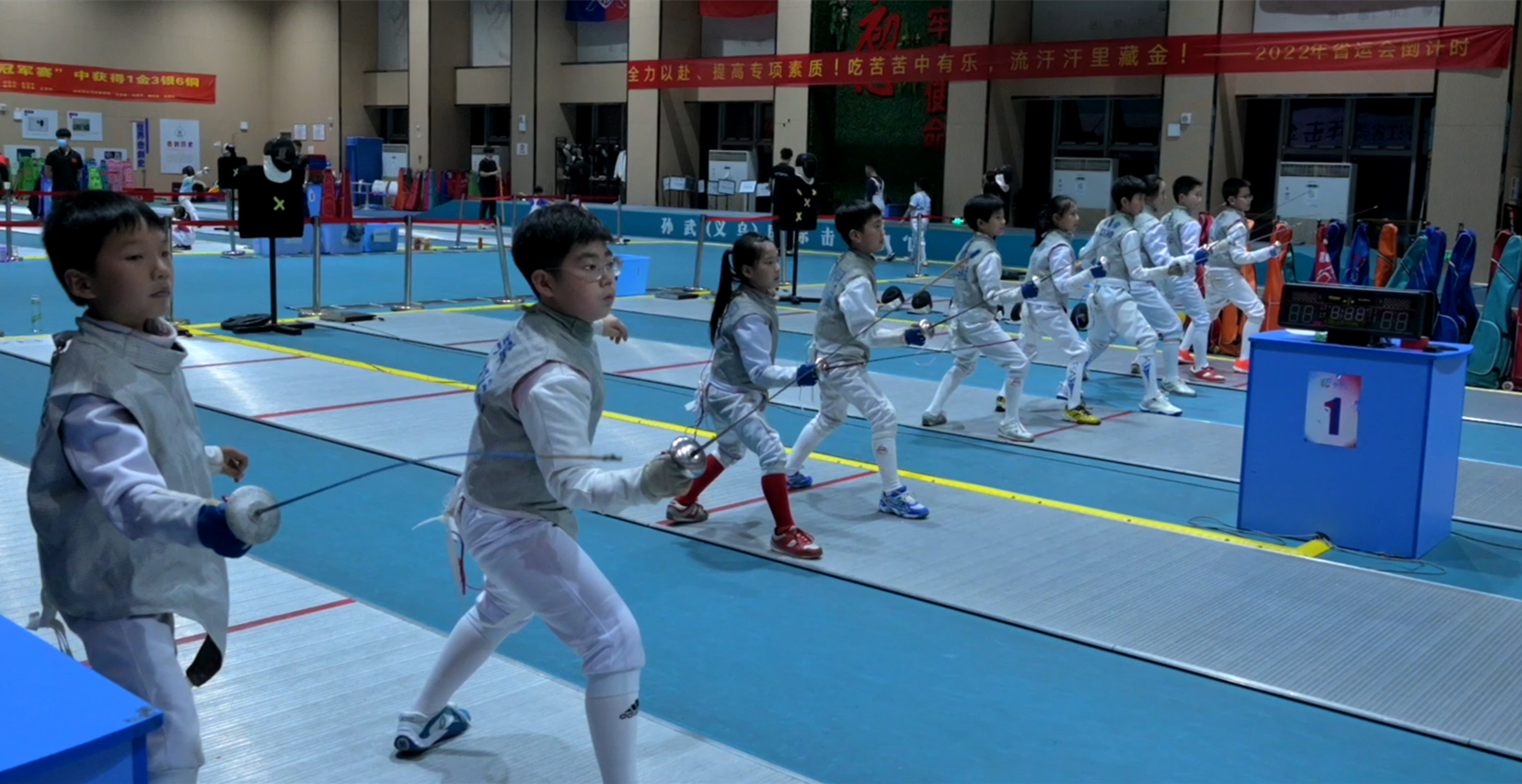 倏忽间,心念流转,电光火石,剑声铿锵……在长14米、宽约2米的剑道上,满是速度、力量、悬念。每到夜幕降临,在市文化广场全民健身中心,义乌市击剑队的小运动员们就会上演紧张的备战训练。队员们你来我往,长剑碰撞的清脆声此起彼伏,每一个娴熟动作的背后是日复一日坚持练习。