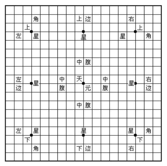 再来看看围棋本身吧。围棋的棋盘,横线竖线各19条,横竖线相交的点叫“交叉点”,共有361个。其中9个特殊交叉点被称为“星位”,最中央的位置就是“天元”。