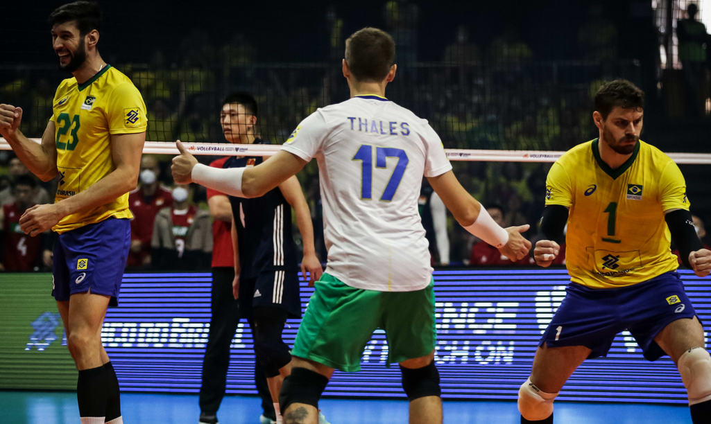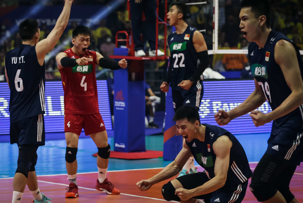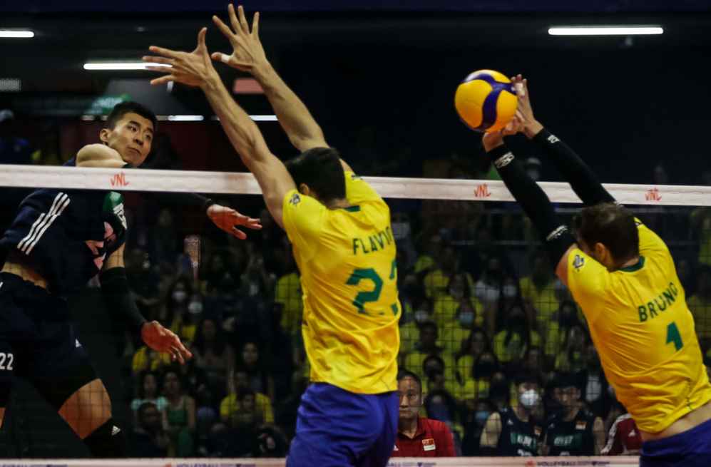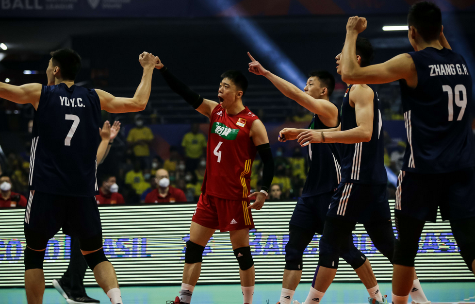 卢卡斯发球又卡中国,阿兰再送一分,阿德里亚诺自接自扣被拦,20平后又让阿兰和阿德里亚诺抓反击,中国没放弃,对手发球送分,莱奥轻拍被拦,一传不稳阿兰也能打中,就算被巴西先拿赛点,中国还是顽强抓住两次防反,还利用卢卡斯的失误反拿局点,两次拦网都差一点抓住阿兰,29平后巴西触网,张景胤跳发直接得分,中国31比29再胜,拿到本届世联第一分。