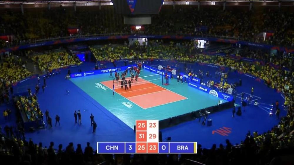 当天面对强敌巴西,中国队延续了前一天的良好状态以25:23拿下第一局;第二局比赛双方进入鏖战,比分一直紧咬,一番苦战后中国队以31:29再胜一局;第三局比赛巴西队状态有所上升,但中国队丝毫没有放松,继续以我为主,大胆进攻,以25:23拿下决定胜负的一局。