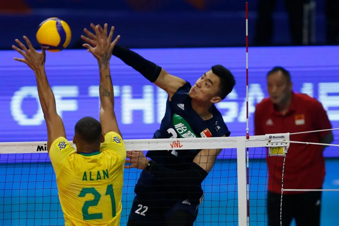 6月12日,中国队球员张景胤(右)在比赛中扣球。新华社发(卢西奥·塔沃拉摄)