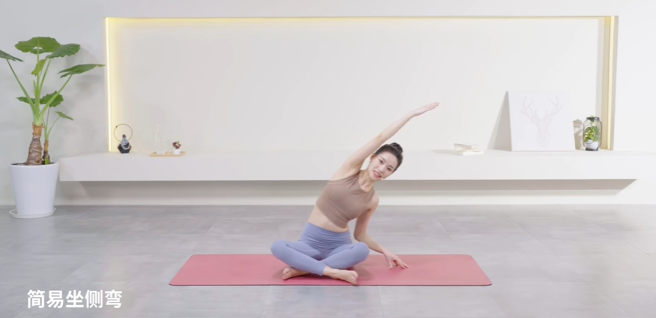 盘腿坐姿,手扶膝盖,脊柱向上挺拔。吸气双臂提起,呼气时身体向右边侧弯,右手落向地面,左大臂贴着耳朵,手指尖伸向右上方。身体向右,坐骨左侧下沉,身体慢慢向下,目视前方。呼气回到坐姿,换到对侧重复。每次保持5-6个呼吸。