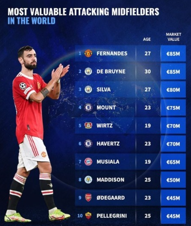 近日,德国足球转会市场更新了世界足坛的球员身价,并依照这份最新的球员身价数据,制作了一份进攻型中场身价排行的Top10榜单。其中,曼联中场布鲁诺-费尔南德斯和曼城中场德布劳内身价均达到了8500万欧,为目前世界上身价最高的进攻型中场。