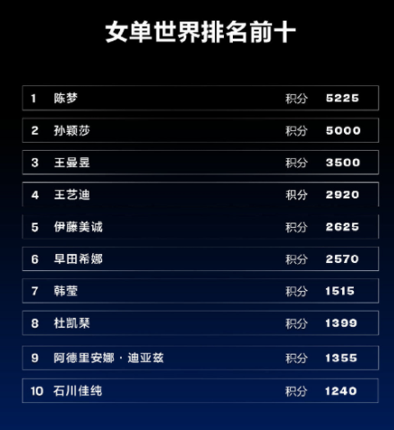 另外,德国华裔老将韩莹目前世界排名来到了第七的位置,杜凯琹、迪亚兹和石川佳纯分别第八到十名。
